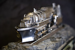 A detail view of the automata sculpture "The Engine That Can". It shows a closeup macro view of the front of the transporation amalgam, particularly details of oil barrels attached to the front of the cargoship components and a semi-truck cab.