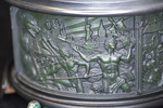 A detail view of the automata sculpture "Get Over It". It shows a portion of the relief motif along the base of the automata of some mostly naked muscular figures fighting off a bear; the Statue of Liberty and a clock tower are visible in the background.