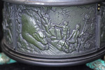 A detail view of the automata sculpture "Get Over It". It shows a portion of the relief motif along the base of the automata. An industrial shipyard is seen in the background, with naked figures approaching a bear sleeping in a cliffside cave above the shipyard.