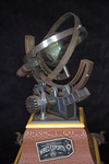 The sculpture features a globe; the surrounding mechanisms resemble a gyroscope and sextant.