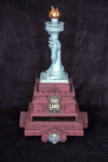 The sculpture looks like the hand and torch of the Statue of Liberty above a miniaturized multi-story building.